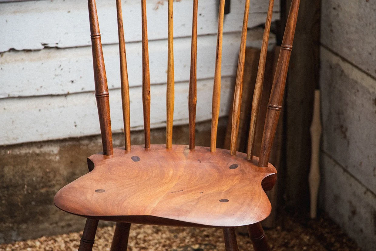 Close-up of a wooden chair with vertical spindles and a rounded seat.