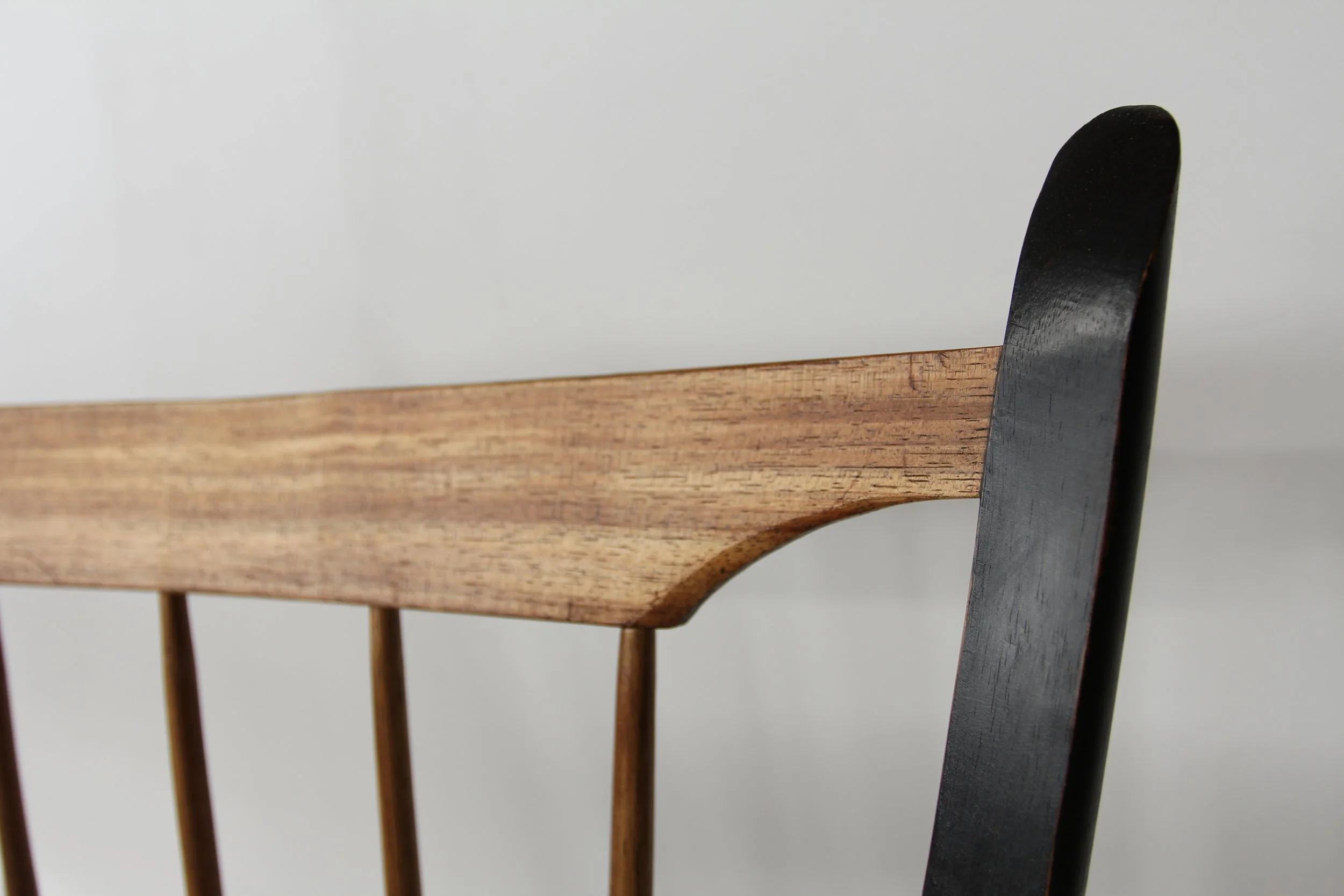 Close-up of a wooden chair with a dark seat and light brown spindle backrest, featuring contrasting black legs.