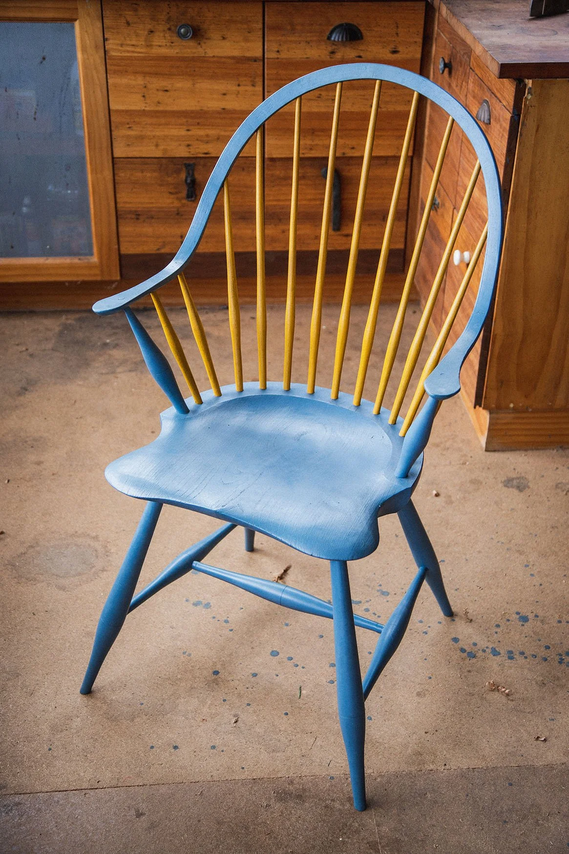 A blue and yellow wooden chair in a workshop with wooden cabinets and tools on the walls.