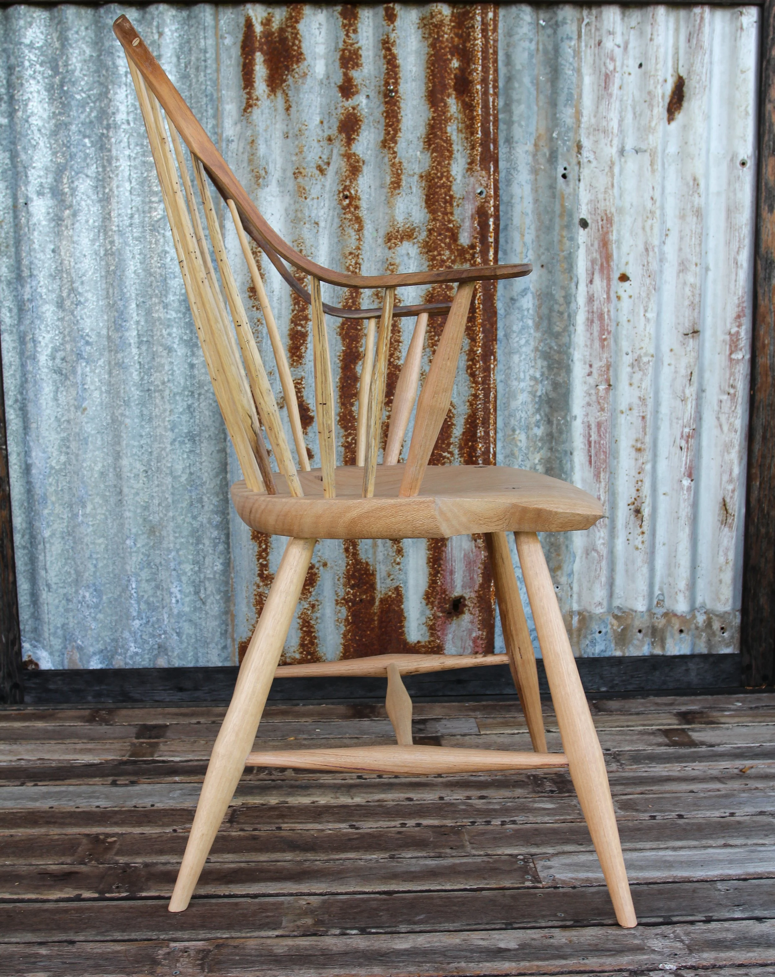 Close-up of a wooden Windsor chair with a curved armrest and spindles, set against a rustic metal background.